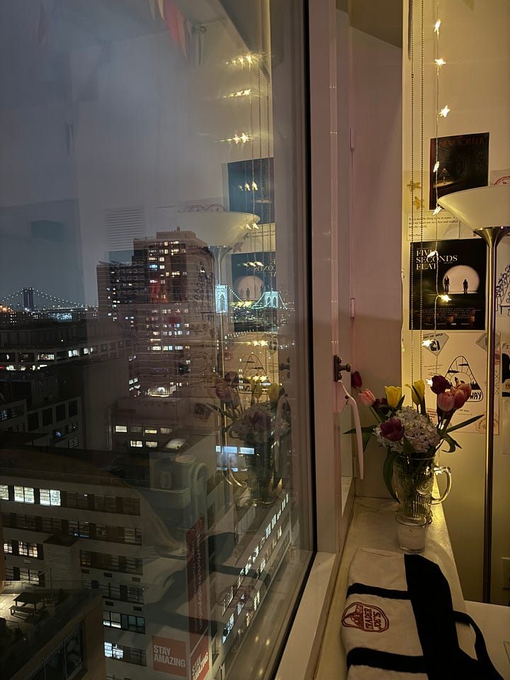 I used to be really nervous about the windows across from my bed in my dorm. I used to feel exposed to the idea that anyone from expensive apartments across could see me and all that I do the same way I could see them. But as I was working last night, I looked up with this memory and felt nothing. I wasn’t anxious. I wasn’t scared. I felt fine - I had adjusted.
